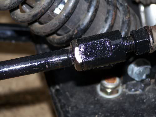 I had designed the steering rack extensions to lock into the tie rods by virtue of their bottoming out in the hole but Earl wanted lock nuts added. The problem was that there was not much thread left so I bought one M14 stainless steel nut and split it in two to make the two locknuts I required. Sadly the extensions that I had made out of 4140 grade steel are not immune to rusting, hence the black paint.